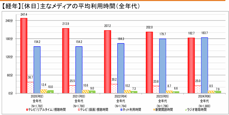 総務省の調査では、多くの世代でインターネットの利用時間がテレビの視聴時間を上回っており、情報収集の主戦場が完全に移ったことを示しています。