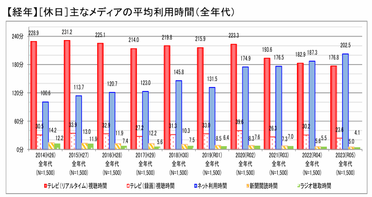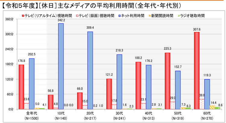 総務省が毎年実施している調査によると、休日のメディア利用時間は、全年代で「インターネット利用」が「テレビ(リアルタイム)視聴」を上回るという大きな転換点を迎えました。